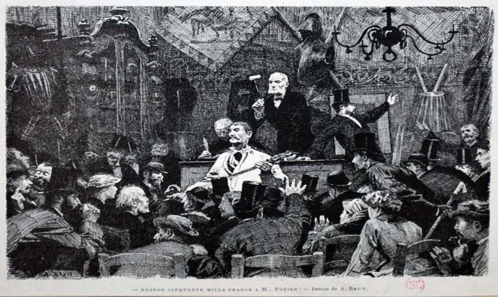 Image à la une: « Adjugé cinquante mille francs à M. Potier ! – Dessin de A. Brun », vente de curiosités et antiquités à Drouot vers 1885. (© Cabinet des estampes du musée Carnavalet, série Topographie Drouot, 144B ; image tirée de Charpy 2022, p. 1036 fig. 9.13)